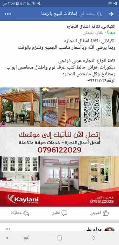 الكيلاني لكافة اشغال النجاره وبما يرضي الله وبااسعار تناسب الجميع ونلتزم بالوقت كافة انواع النجاره عربي فرنجي ديكورات خزائن حائط كنب غرف نوم واطفال محامص ابواب ومطابخ وكل مايخص النجاره الرقم٠٧٩٦١٢٢٠٢٩